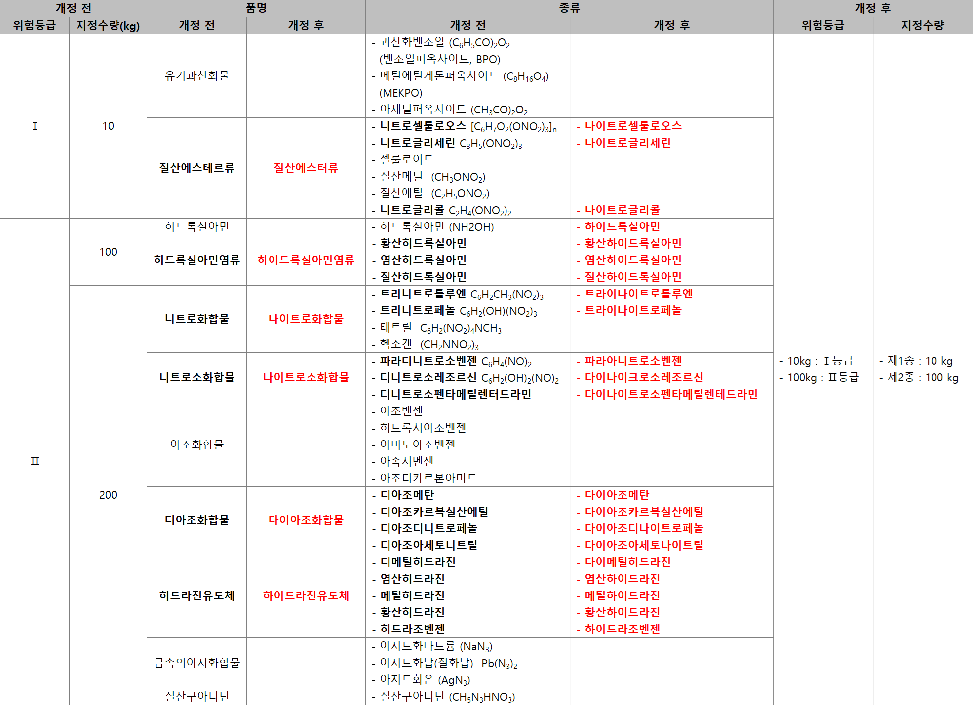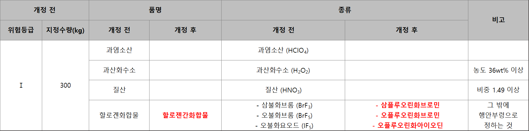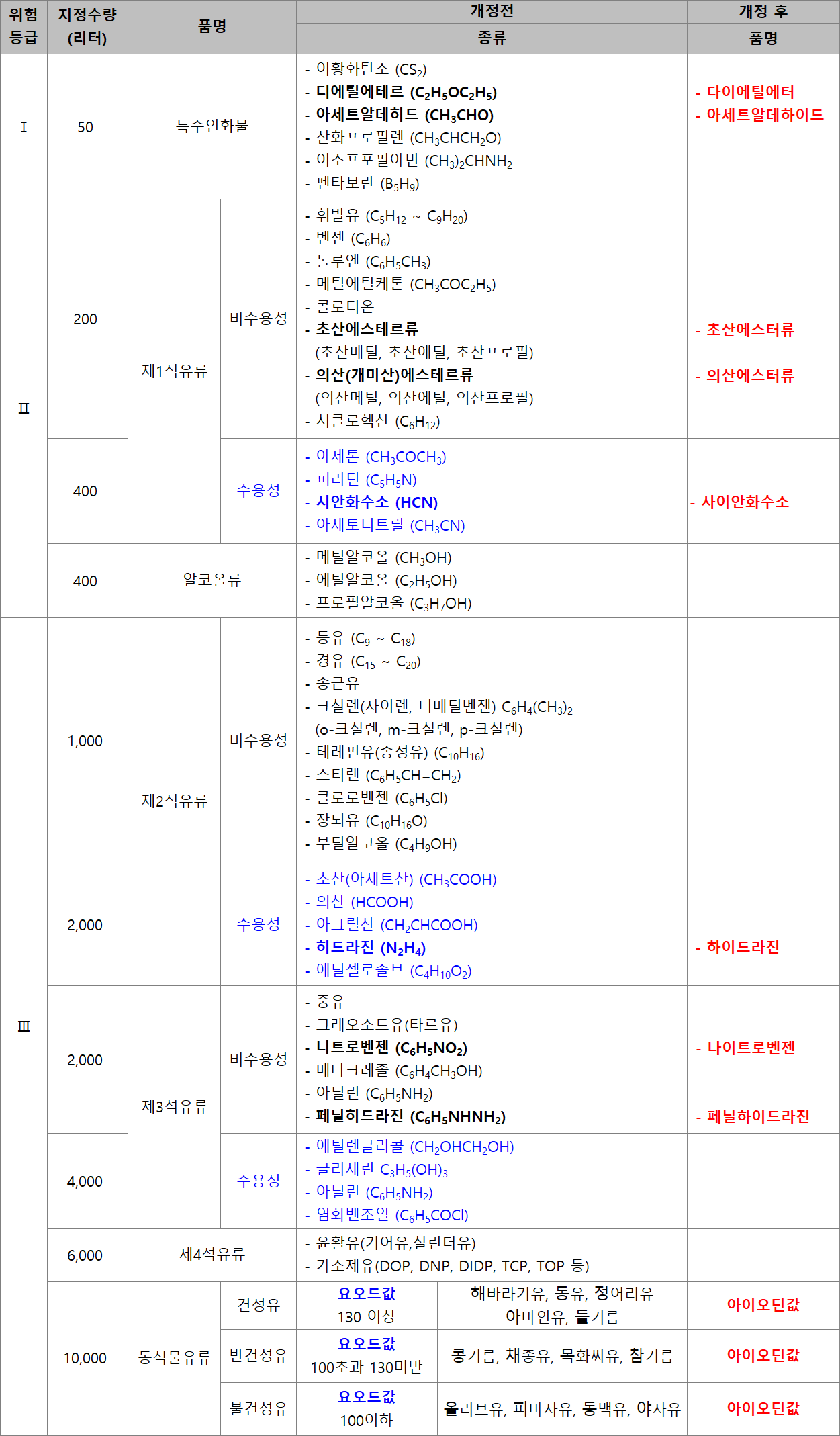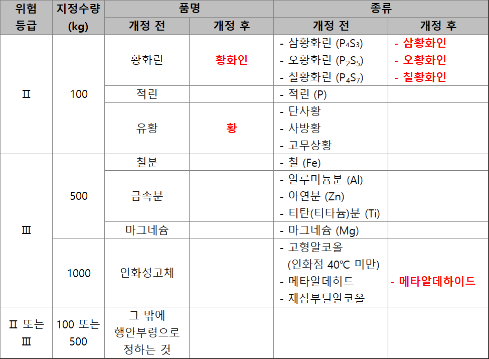 - 변경 내용 : 린 → 인(적린 제외), 유황 → 황, 알데히드 → 알데하이드